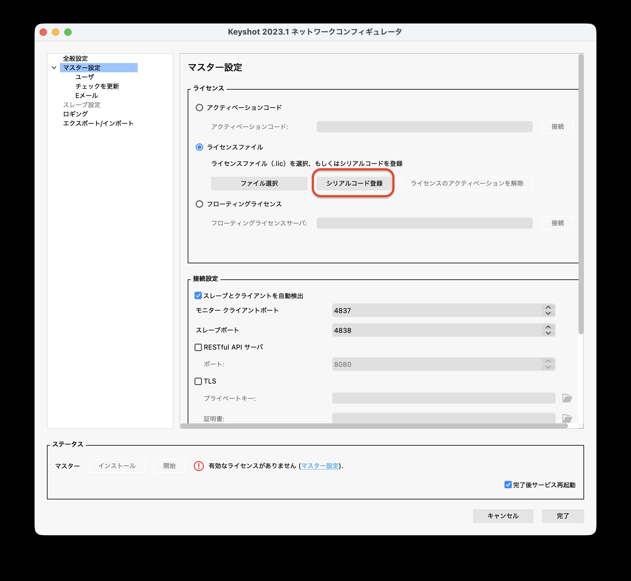 ネットワークレンダリングツールのインストールは下記の手順で行います。 こちらのページからNetwork rendering プログラムをダウンロードしてインストール。 KeyShotネットワークコンフィギュレータを起動します。 Master設定を選択します。 アクティベーションコードを入力して接続を押します。ネットワークライセンスは自動的に有効化されます。 上手く行かない場合はリクエストファイルを保存を選択して(その際日本語パスは避けてください) ...