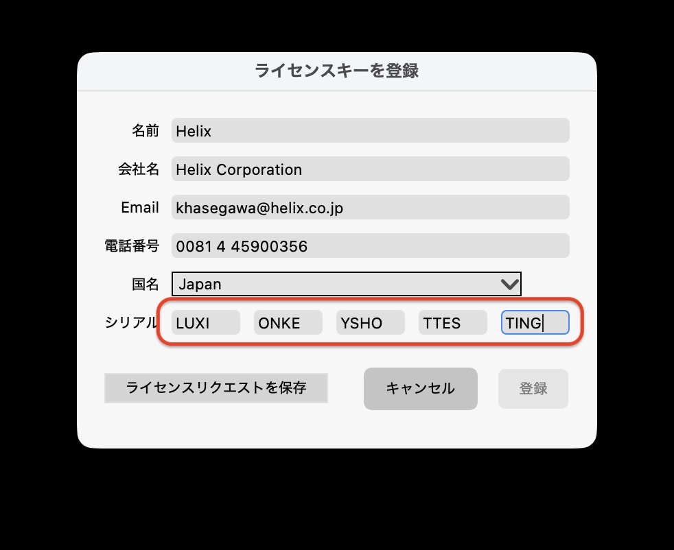 シリアルコード登録を選択します。各項目を入力後シリアル LUXIONKEYSHOTTESTINGを入力してライセンスリクエストを押してリクエストファイルを作成します。